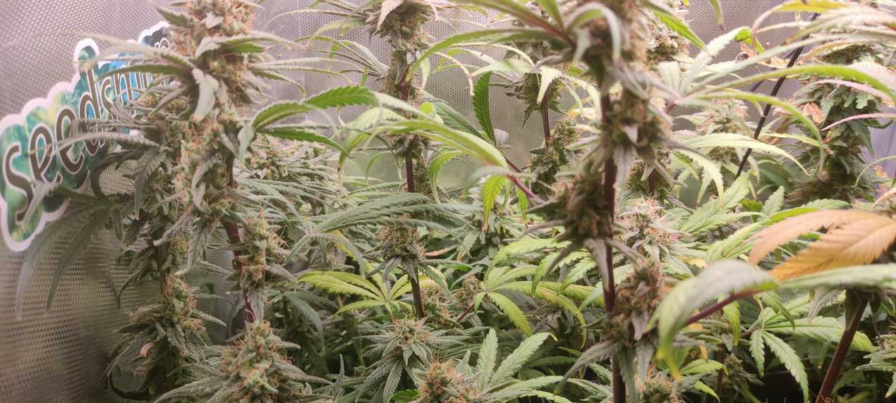 Ето ги тук след меласката. Другия път един Кана флорес, защото имам от него още. Това ще им е първо торене, освен пресаждането разбира се. Станах дори още по-пестелива с торовете, мисля нищо да не купувам за този гроу, освен една заредена почва за последните саксии. Измислила съм още по-елементарна схема с мин вложения на време и торове.Предишният път Кана терата се оказа с допълнителни минерални торове и адски силна и затова няма да ползвам този вид вече, аз тогава наторих допълнително със сух тор Комплийт органикс(с още азот) и в резултат някои по чувствителни и дребни растенийца се "азотнаха" и това не доведе до добър цъфтеж според мен. А до някакви кичури такива рехави. На снимката се вижда как съм чупнала най-високите връхчета, малко да се заздравят и малко надолу да влезе светлина и да тръгнат и следващите. Вече щом видя, че изхвърча някое връхче твърде нагоре го чупвам своевременно, кропинга е много хубаво нещо за тях, дори и да се изпраеи после! То може и да се вържат счупените, за да не се изправят, даже е желателно поне докато се втвърдят. Също подпъхнах листата, така че да се осветят колкото може връхчета. Тези листа и ще ги махна, но още не ми се изваждат едно по едно.