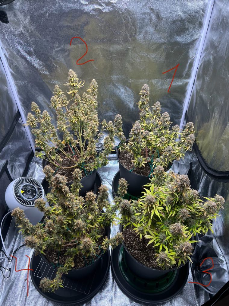 Според мен остават около седмица две трихомите да са напълно млечни и леко кехлибарени около 10% и ще режа . Мисля че ppm/EC от дренажите на саксиите при последната поливанка трябва да е 0 преди да ги отрежа, за да няма гаден вкус и тн ? Знам също че е хубаво да ги отрежа и сложа да се сушат примерно 30/40 мин преди края на последният им тъмен период от 6 часа и почвата да е изсъхнала . Сега така лека полека смъквам ppm като поливам само с дестилирана вода и отдолу от дренажа изтича от всяка саксия около 100/150мл с EC 0.8/1.0 , но ако трихомите са готови преди да съм смъкнал Ец-то на 0 ще ги промия с дестилирана вода толкова колкото да смъкна PPM/EC до 0 или с Cana Flush което бях купил и тогава ще изчакам да изсъхне почвата и режа . А в момента лампата им е на 270 PPFD чудя се дали да я увелича утре от 50% на 75% и така ще ги направя на 400PPFD освен растение номер 2 то е 10 см по високо к ще стане на 580PPFD?