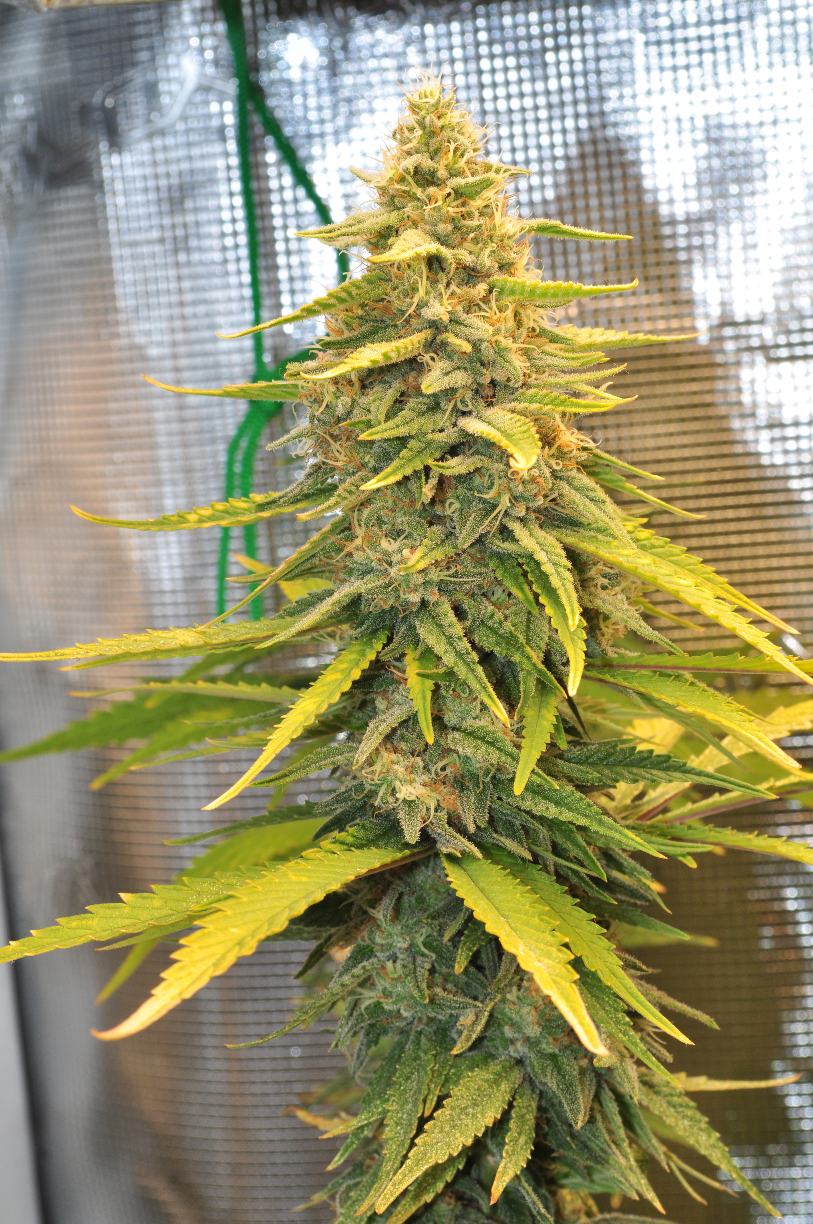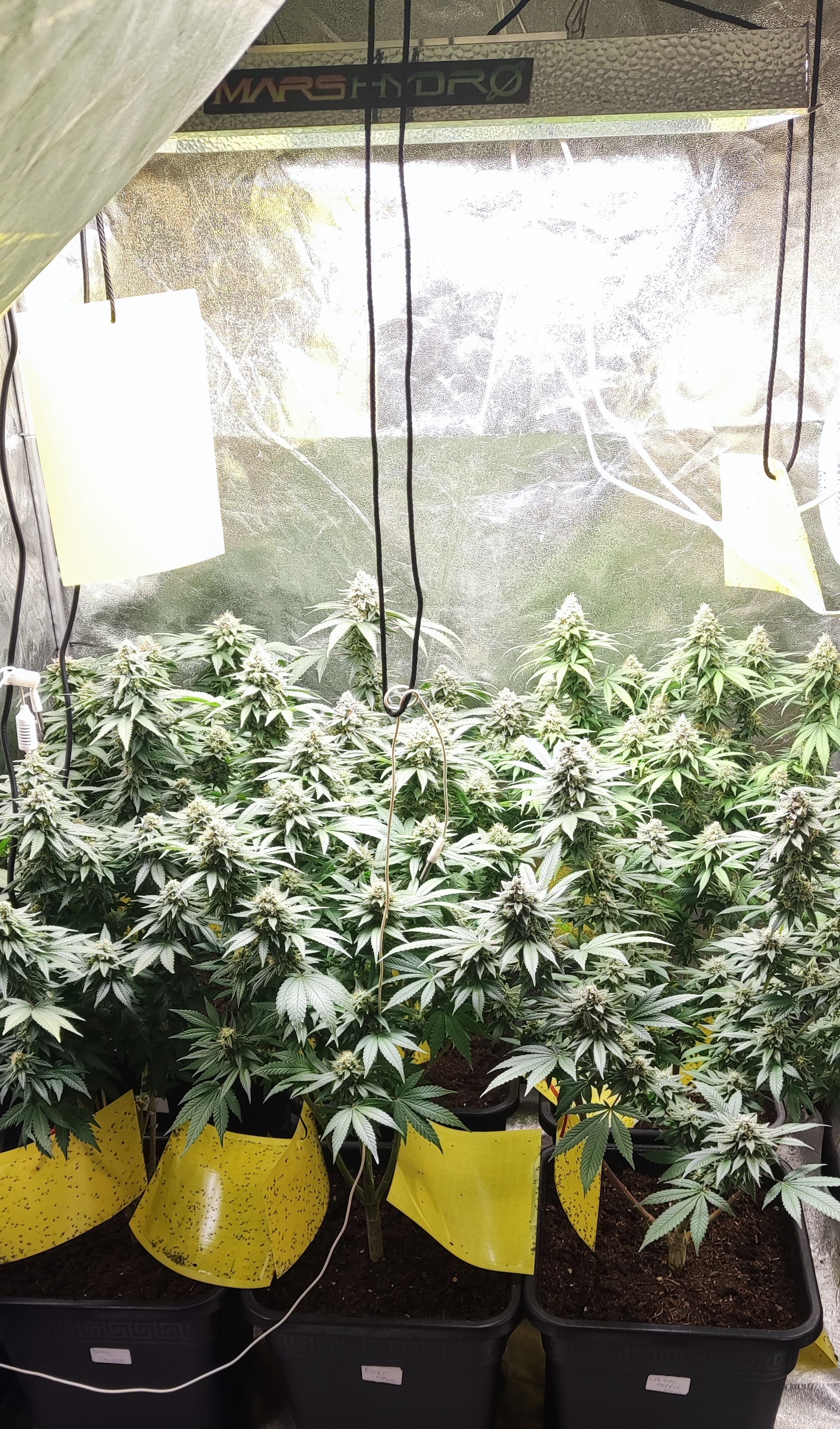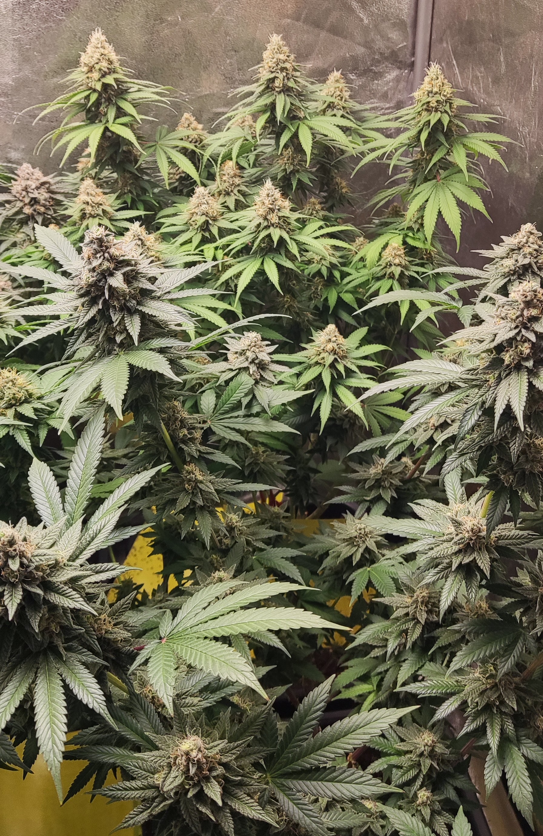 Здравейте, ето ги и тези вътре. От днес в 8-ма седмица цъфтеж, панела съм го приближил на 35 см за последните няколко седмици. Цветето, което е в дясно от вътре е същия клонинг на Galet OG, който го гледам и на вън. И двата са еднакво жълтеникави, това не мога да си го обясня защо се получава. Майката не е била такава. Последните 2 седмици му давам повече храна на него, но няма никаква разлика. Развива си се съвсем нормално, малко бавно от другите сортове.
