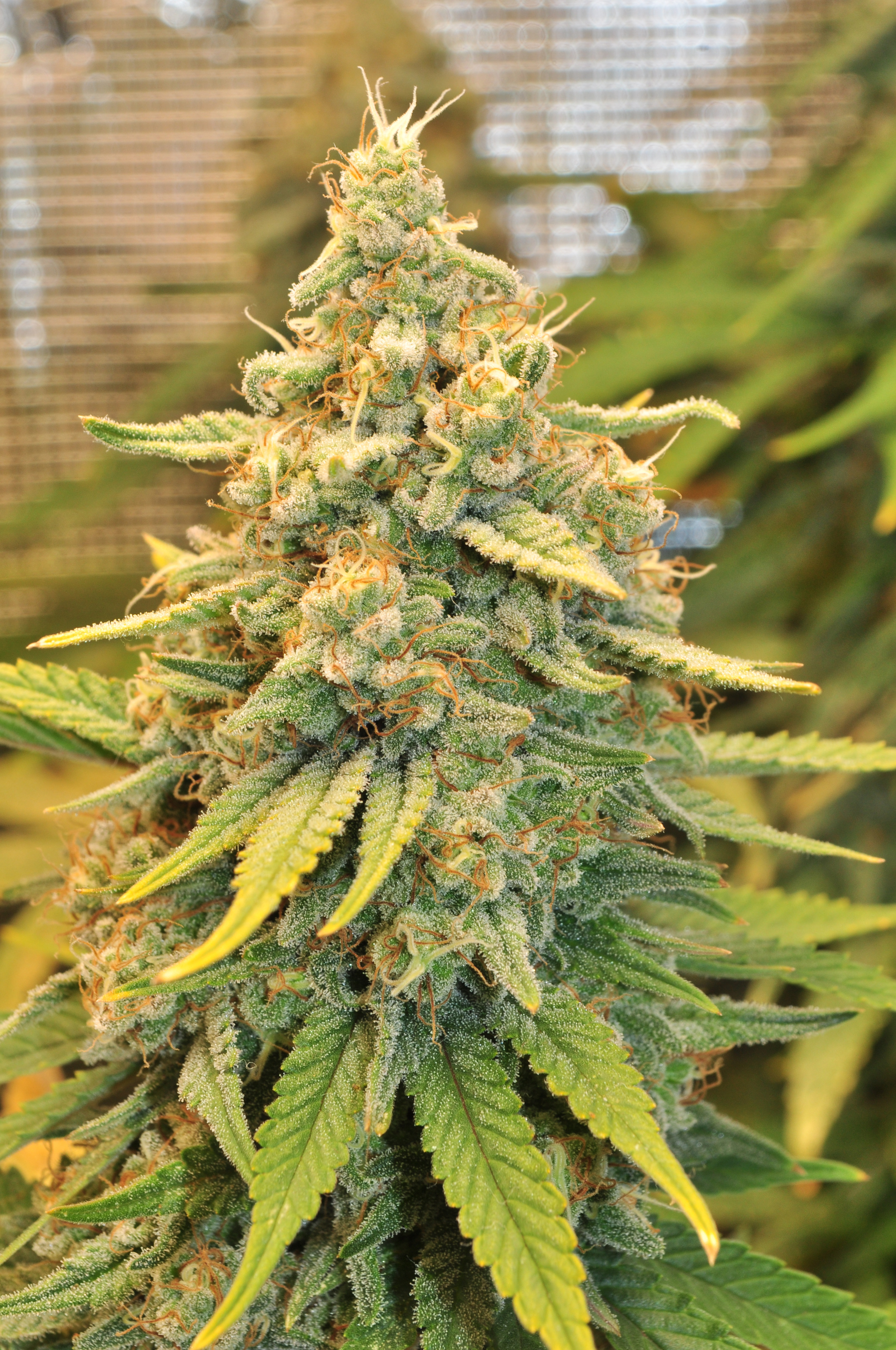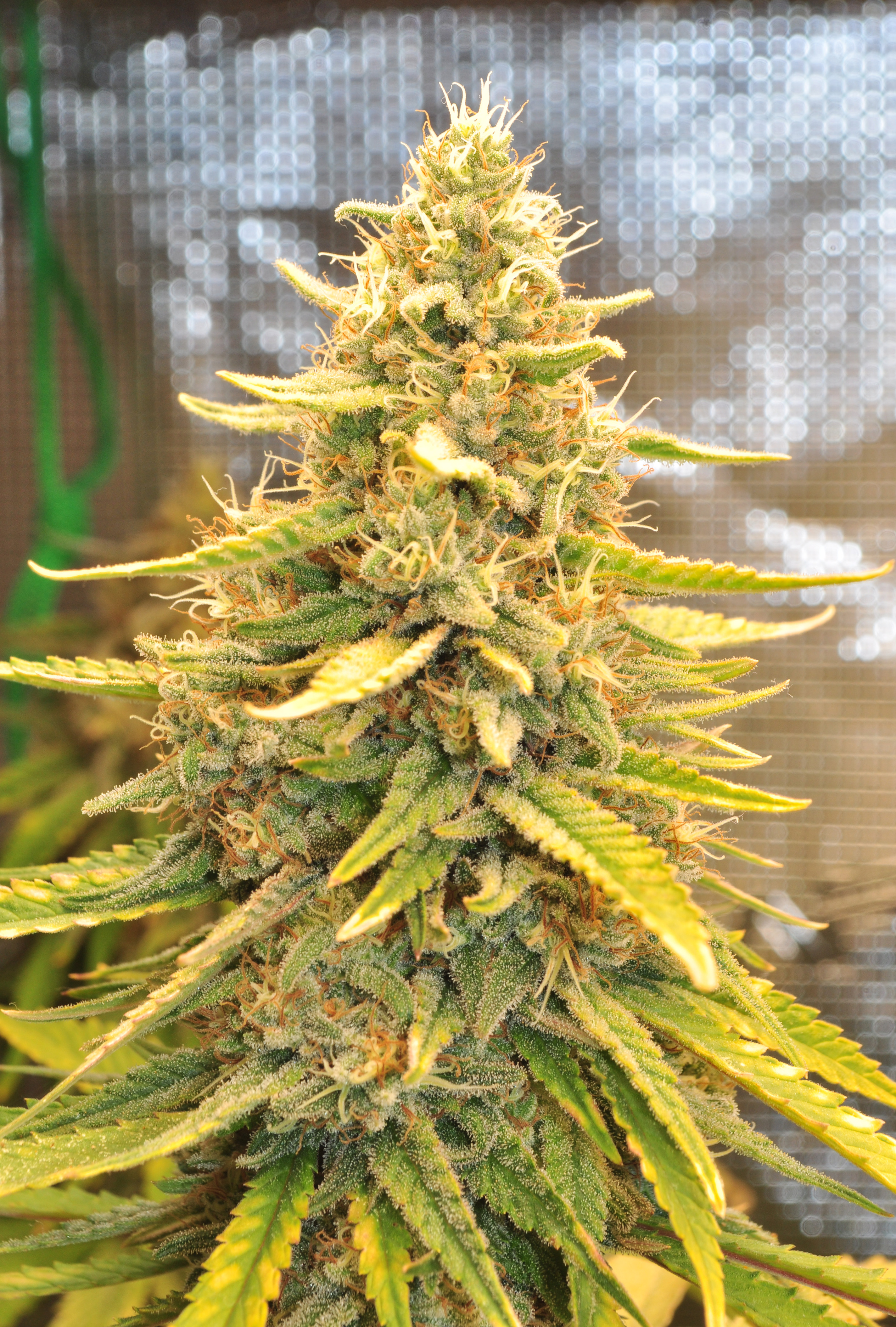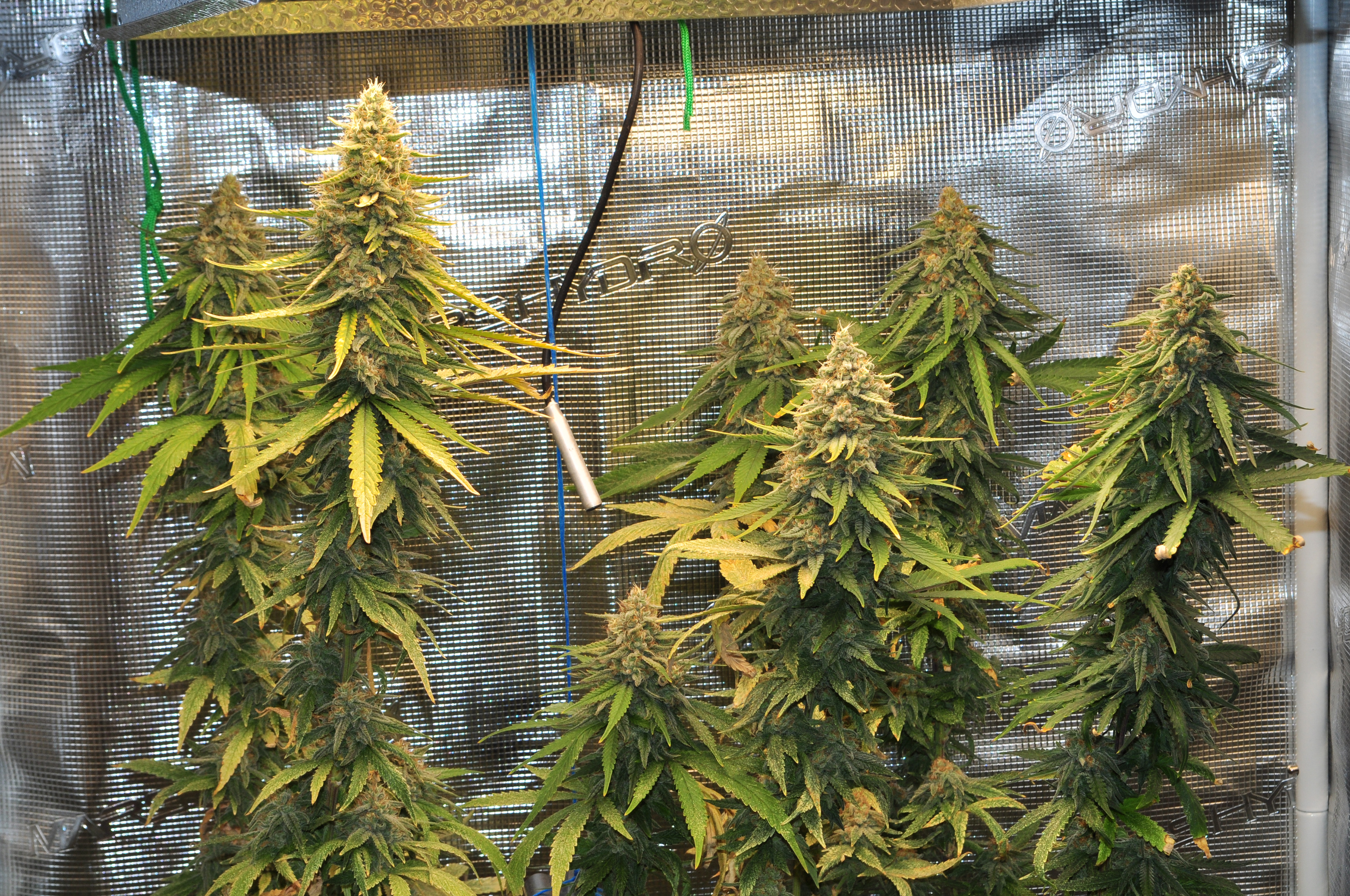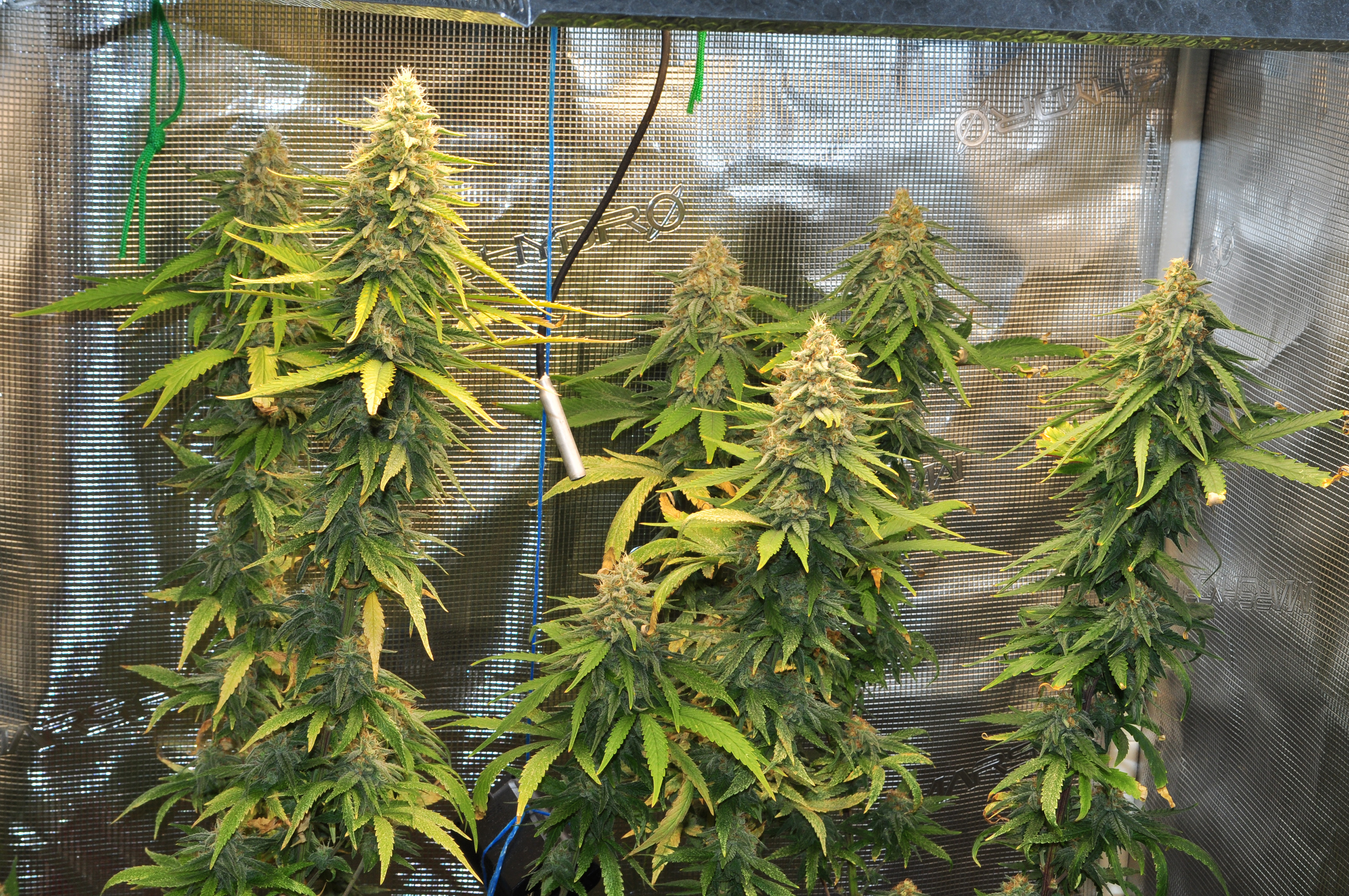 Здравейте, ето ги и тези вътре. От днес в 8-ма седмица цъфтеж, панела съм го приближил на 35 см за последните няколко седмици. Цветето, което е в дясно от вътре е същия клонинг на Galet OG, който го гледам и на вън. И двата са еднакво жълтеникави, това не мога да си го обясня защо се получава. Майката не е била такава. Последните 2 седмици му давам повече храна на него, но няма никаква разлика. Развива си се съвсем нормално, малко бавно от другите сортове.
